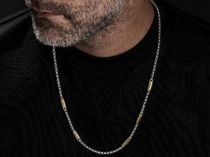 - Pendant necklaces are having a moment in men’s fashion this year. Consider finding one with a mixed-metal look (like our very own Fibreglass Tag Pendant) to create the base for a layered look. Then add a more delicate, slightly shorter gold or silver chain to balance out the look.