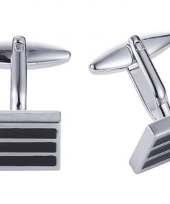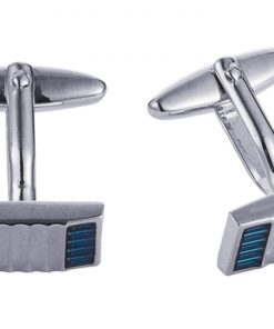 Polished Rhodium Plated Rectangle Cufflinks with Black & Blue Striped Enamel Inlays