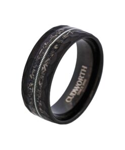 Tungsten Ring, Meteorite Circuit – Faceted black tungsten ring with meteorite and silver wire inlay