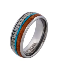 Tungsten Ring, Frontier Horizon – Silver tungsten ring with turquoise, antler, and wood inlays