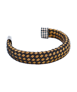 This Stainless Steel Black & Gold Nylon Weave Cuff 480-20 by Cudworth is the epitome of refined masculinity. Its sleek design features an intricate nylon weave in contrasting shades of black and gold, set in durable stainless steel. Perfect for both casual and formal settings, it adds a touch of sophistication to any ensemble.