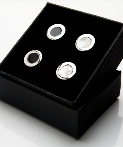 The Cudworth Blk & Mop Double Interchangeable Round Cufflinks are perfect for the modern gentleman with an eye for detail. These versatile men’s cufflinks feature a sleek black design on one side and a sophisticated mother of pearl finish on the other, allowing you to effortlessly switch up your style. With their robust construction and timeless elegance, they promise to elevate any formal ensemble.