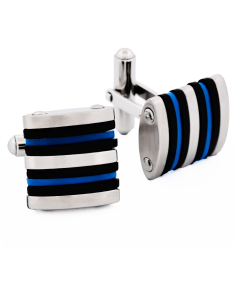 Elevate your style with Cudworth’s brushed stainless steel cufflinks. These sleek, curved face cufflinks are masterfully crafted and feature a contemporary design of black and blue rubber detailing, ideal for the modern gentleman. Versatile and refined, they’re the perfect finishing touch to any suit or shirt sleeve.