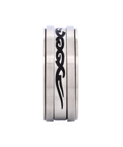 Elevate your style with Cudworth’s Brushed Stainless Steel Spinner Ring. This men’s accessory boasts a sleek, modern design with a black enamel etched centre that adds an intriguing touch, making it perfect for any occasion. Durable yet lightweight, this ring offers dynamic wearability that effortlessly complements your daily style.