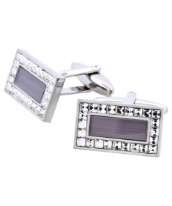 Add a touch of elegance to your suit with these Rhodium Plated Grey Cat’s Eye & Crystal Rectangle Cufflinks from Cudworth. These stylish accessories are perfect for any formal occasion, featuring a distinguished grey cat’s eye stone offset by sparkling crystals. Crafted with high-quality rhodium plating, they promise both durability and shine. Make an impression that lasts with Cudworth.