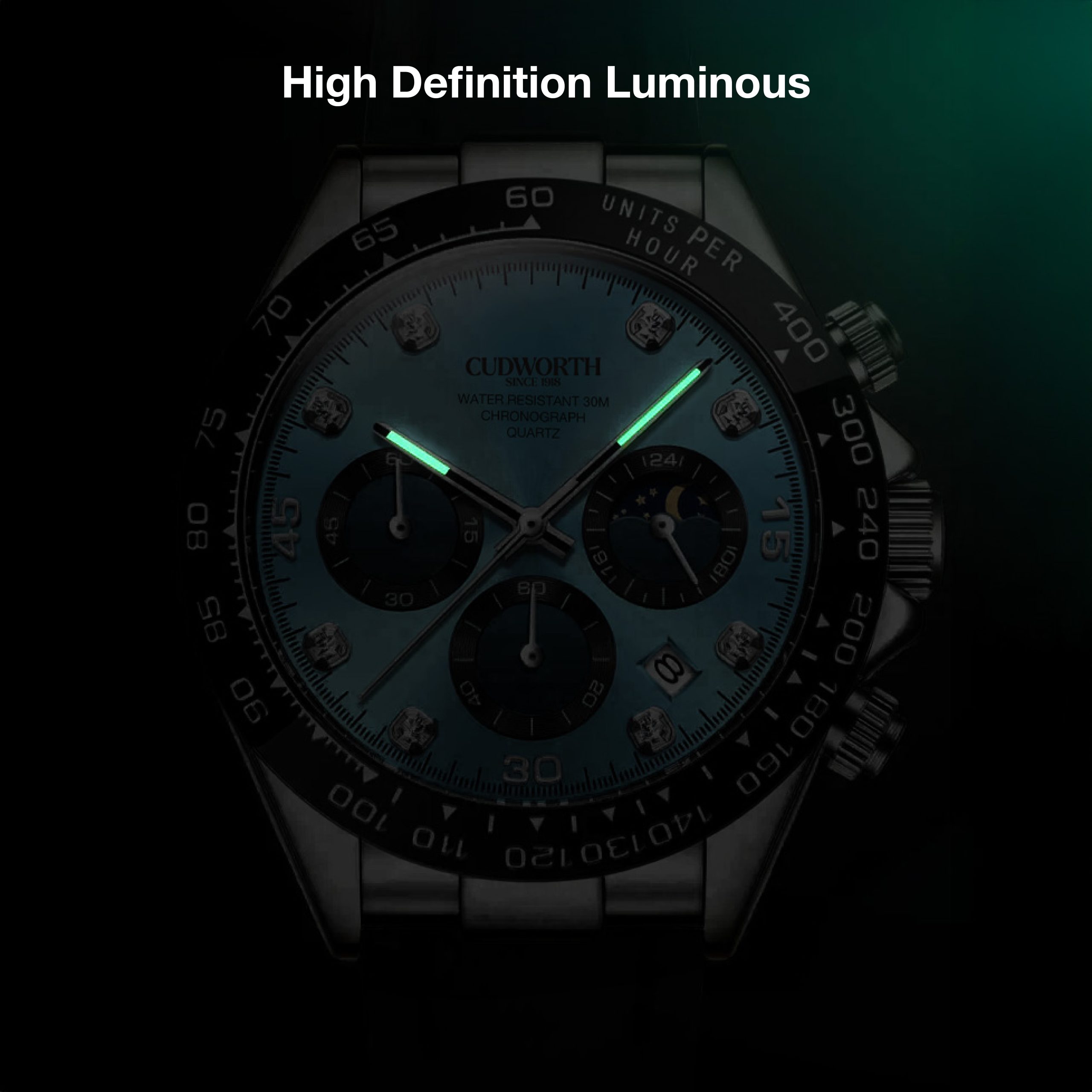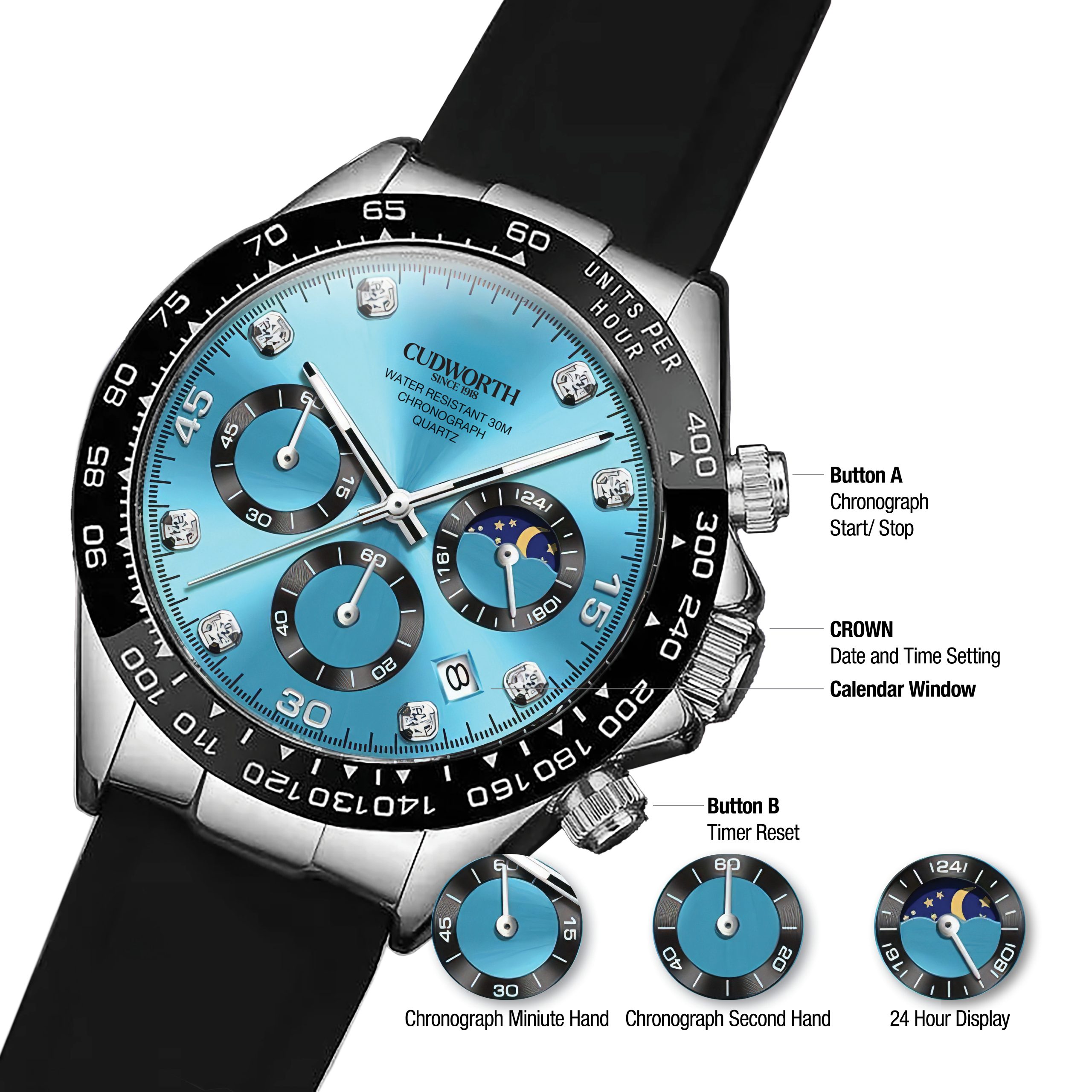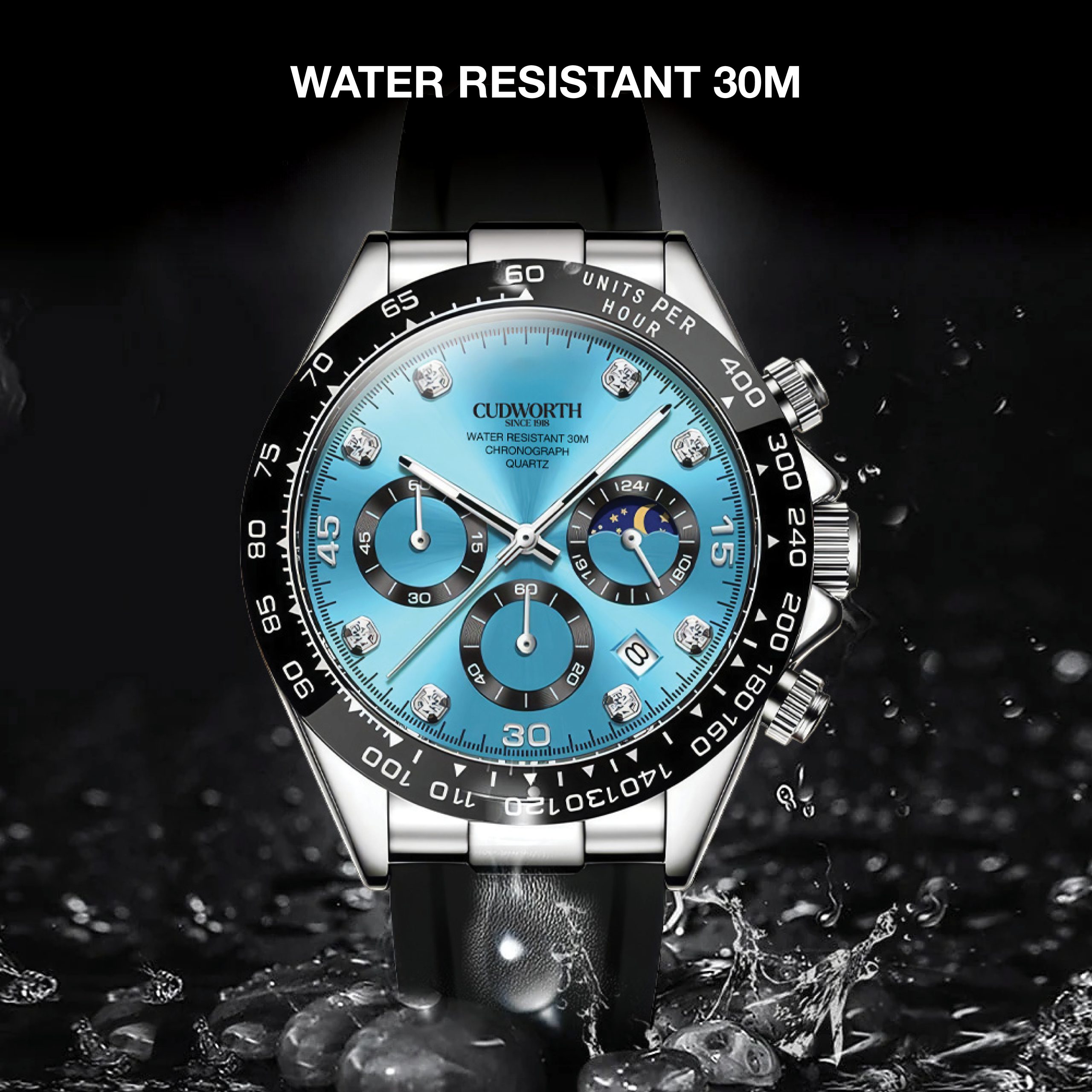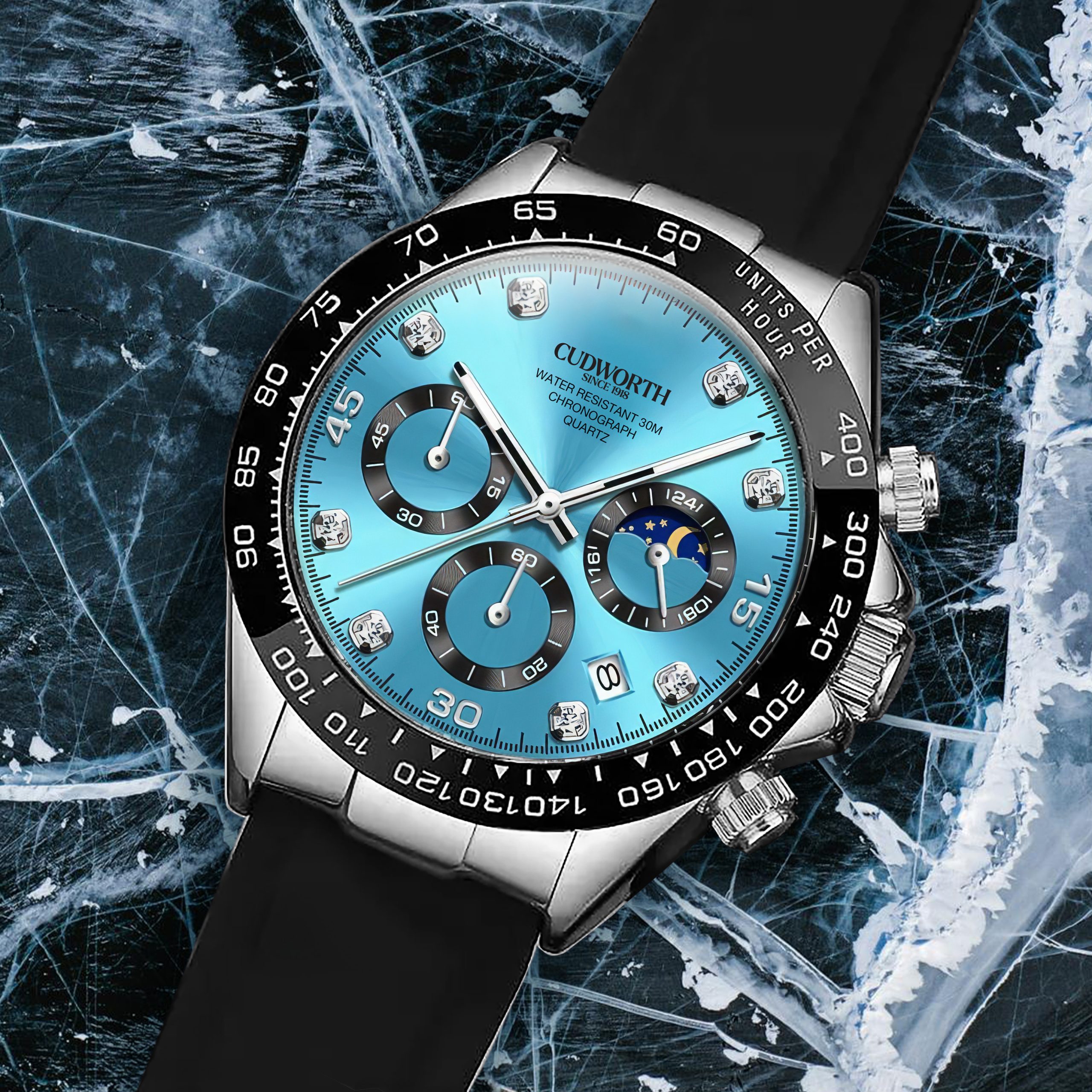 The Cudworth Apex Chronograph series is a bold statement in precision and style, available in three striking finishes: Jet Black, Turquoise, and Gold.