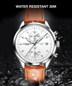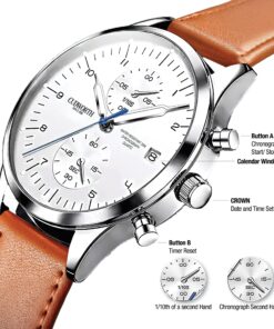 Its clean white minimalist dial is complemented by slim chrome markers and sub-dials for precise chronograph function.
