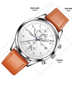 The tan PU vegan leather strap provides a refined finish, ensuring comfort and style while remaining environmentally conscious.