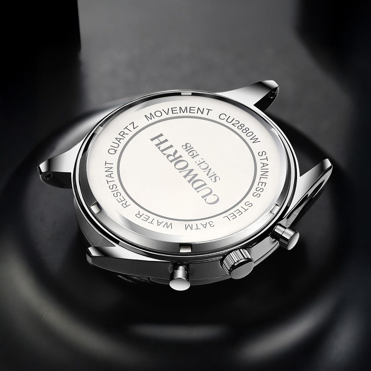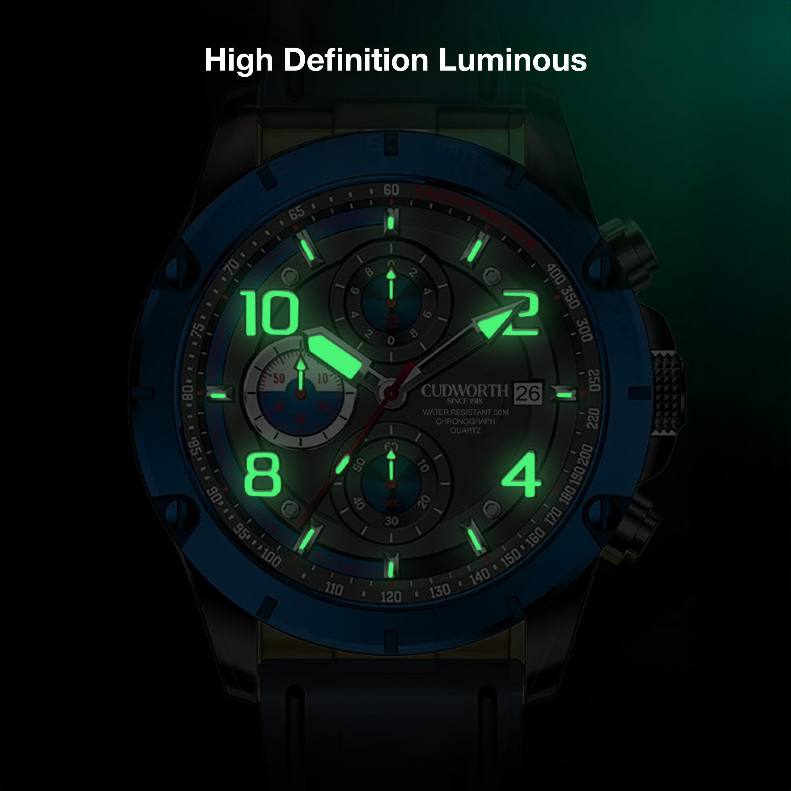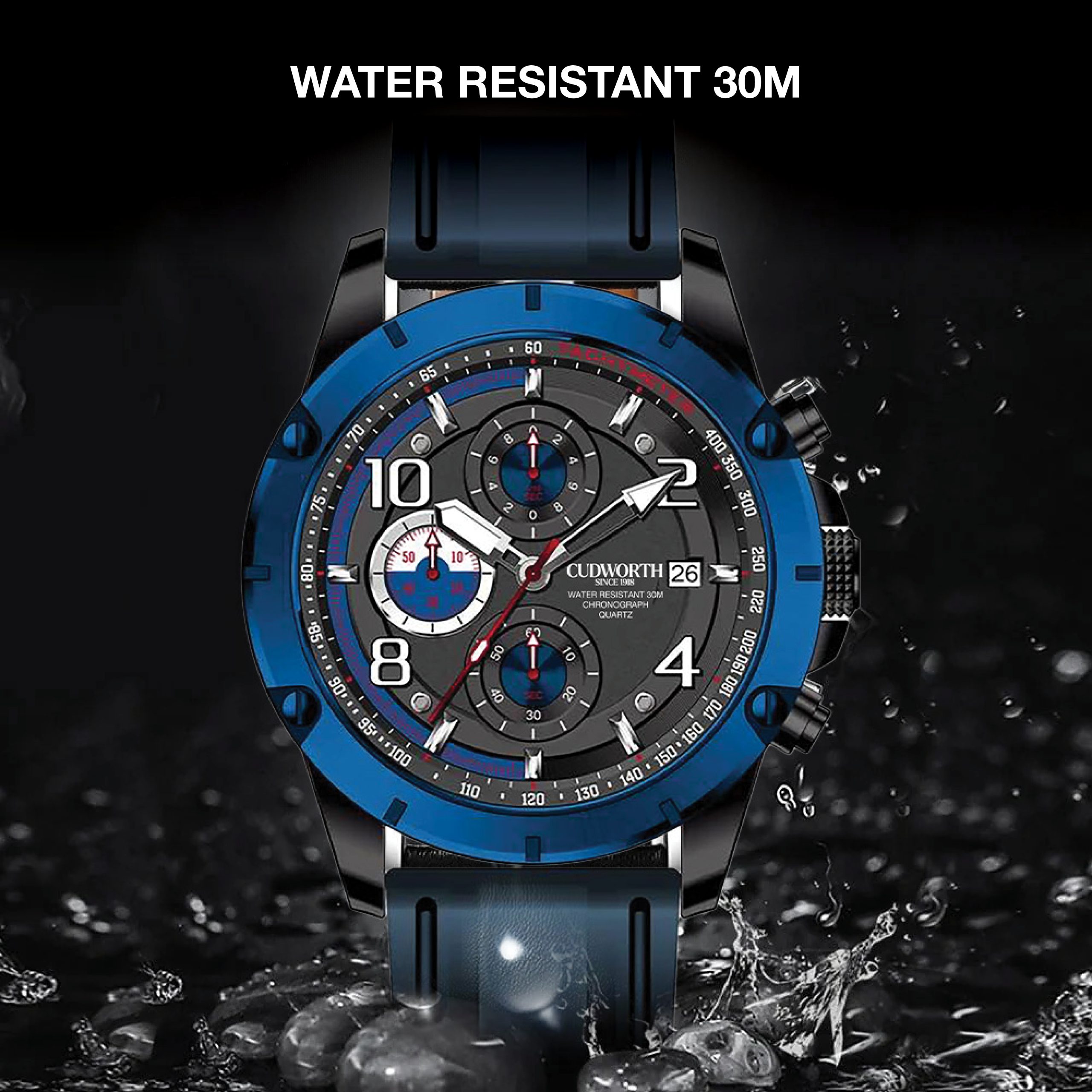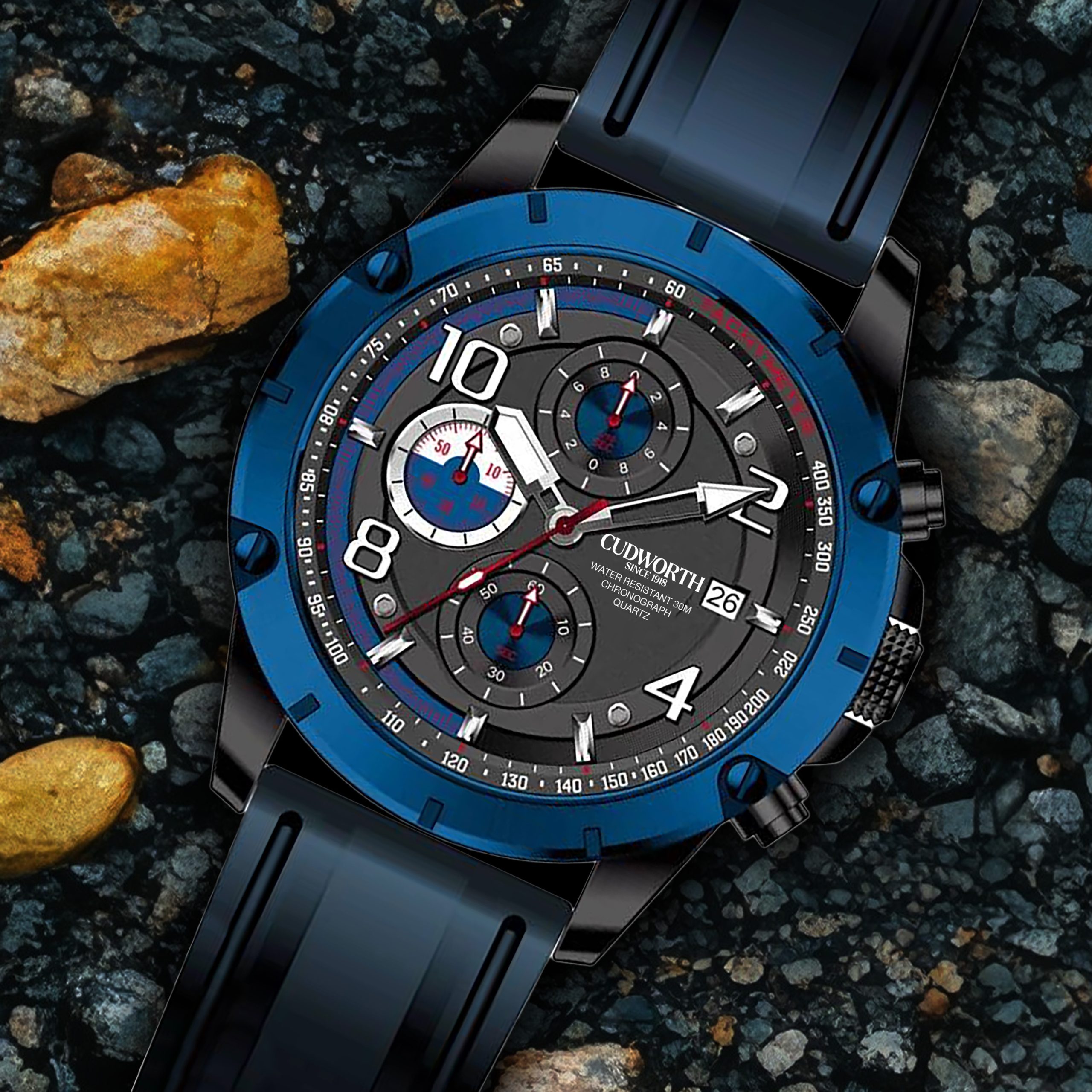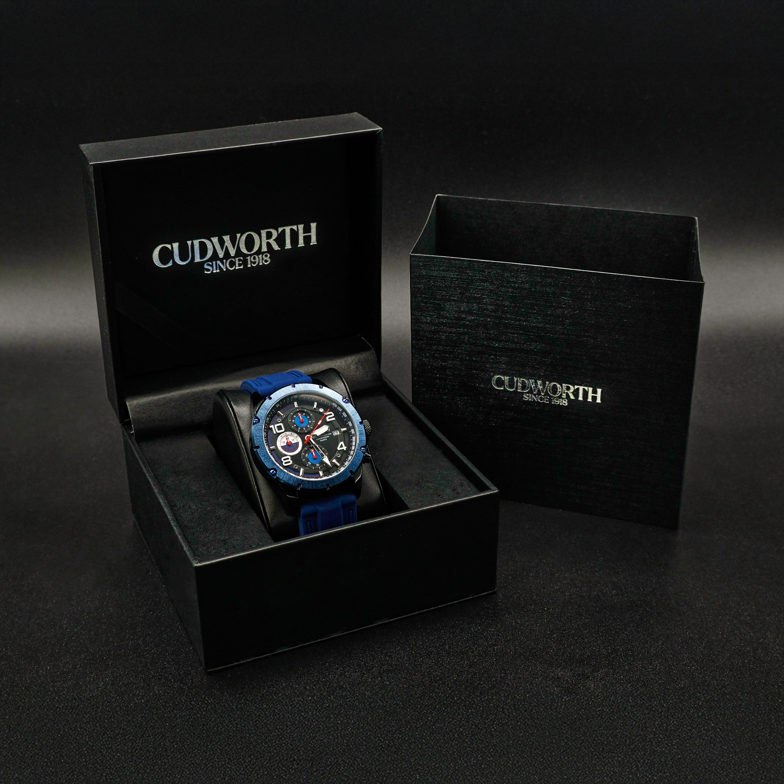 The Cudworth Velocity Chronograph blends motorsport-inspired design with rugged performance, available in both a durable silicone strap and a black steel bracelet.