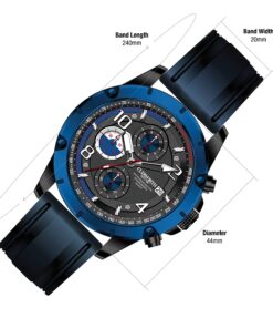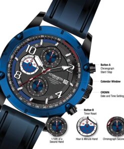 Its dynamic black dial features striking red and blue accents, oversized 10, 2, and 8 hour markers, and three sub-dials for precise chronograph functionality.
