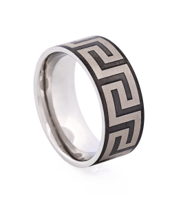This Cudworth men’s ring combines edgy style with timeless class. Expertly crafted from Ion plated black stainless steel, it features a frosted Greek Key pattern adding an understated, yet distinctive detail. Perfect for the modern man seeking an accessory that sets him apart without overwhelming his ensemble. Ideal as a wedding band or simply as a fashionable statement piece.