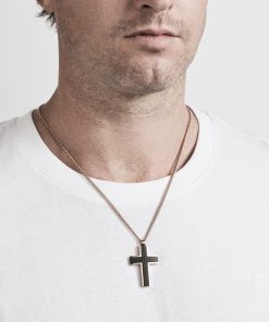 This Cudworth men’s necklace features a unique chequered inlay cross pendant, artistically composed of ion plated rose gold and black elements. The pendant is tastefully displayed on a curbed link chain, also ion plated in matching rose gold. This piece combines modern sophistication with timeless faith symbolism, making it a perfect statement for the stylish contemporary man.