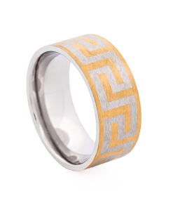 Elevate your style with Cudworth’s Ion Plated Yellow Gold Stainless Steel Ring. This sleek design features a frosty Greek key pattern, offering a distinct touch of sophistication to any outfit. Ideal for both everyday wear and special occasions, this ring combines durability and luxury in one stylish piece.