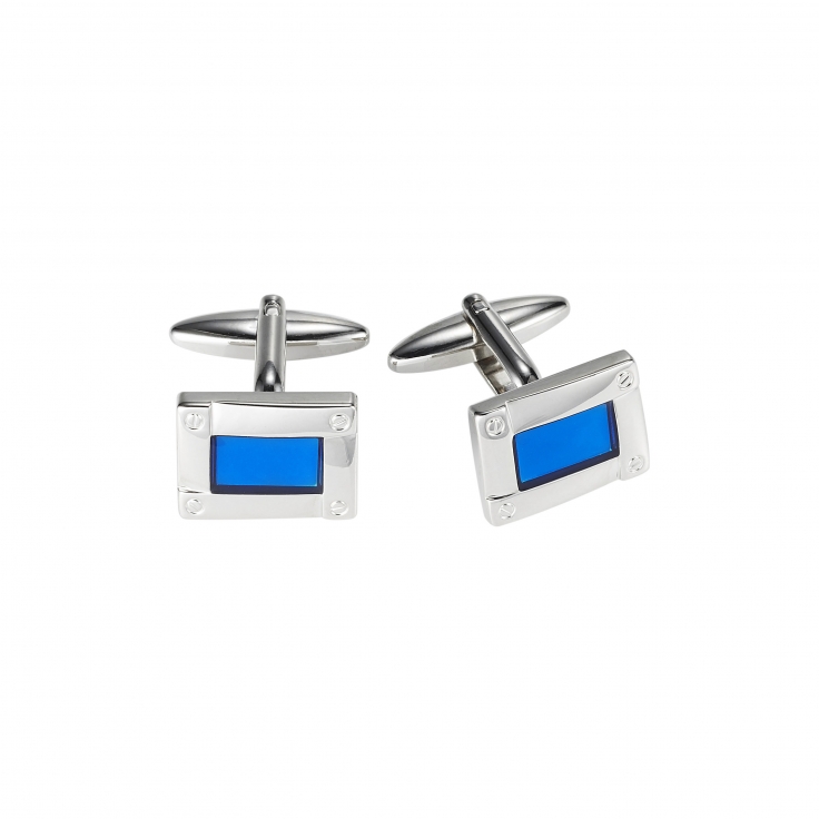 Bring class to your formal attire with the Cudworth Men’s Polished Rhodium Plated Rectangle Cufflinks. Designed with intricate screw details and a sky blue inlay, these cufflinks emanate a subtle elegance. Their sturdy construction ensures durability while their unique design adds a touch of sophistication to any outfit.