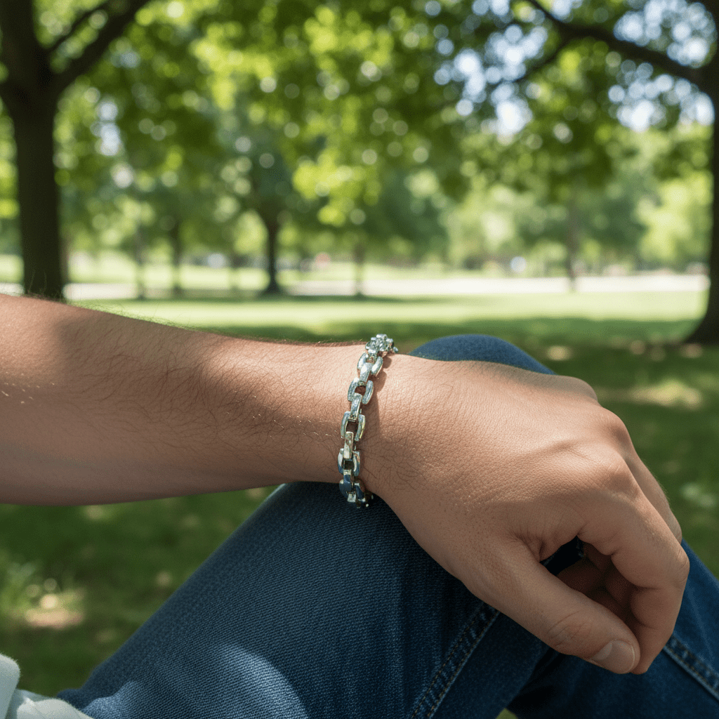 This Cudworth chain bracelet features polished stainless steel links for a sleek, modern look. Its rugged design adds a masculine edge, perfect for everyday wear or special occasions. The secure clasp ensures it stays in place, making it both stylish and functional. Wear it solo or stacked with other accessories for a layered look.