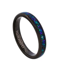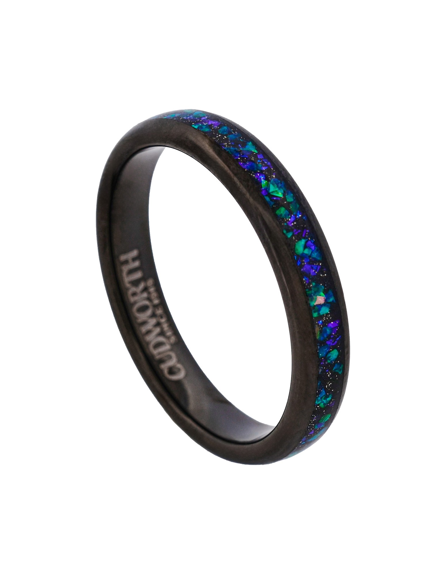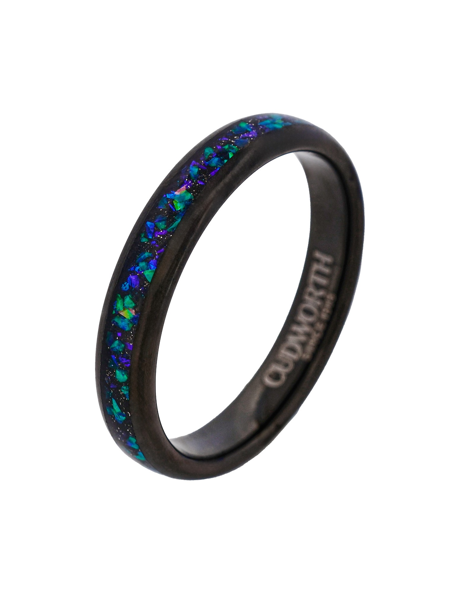 Cudworth’s Aurora Streamline ring offers a sleek, modern profile with a touch of brilliance. The slim black tungsten band is accented by a shimmering opal inlay, shifting between deep greens and blues for a refined yet striking finish. Strong, subtle, and stylish, it’s perfect for everyday wear.