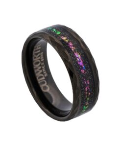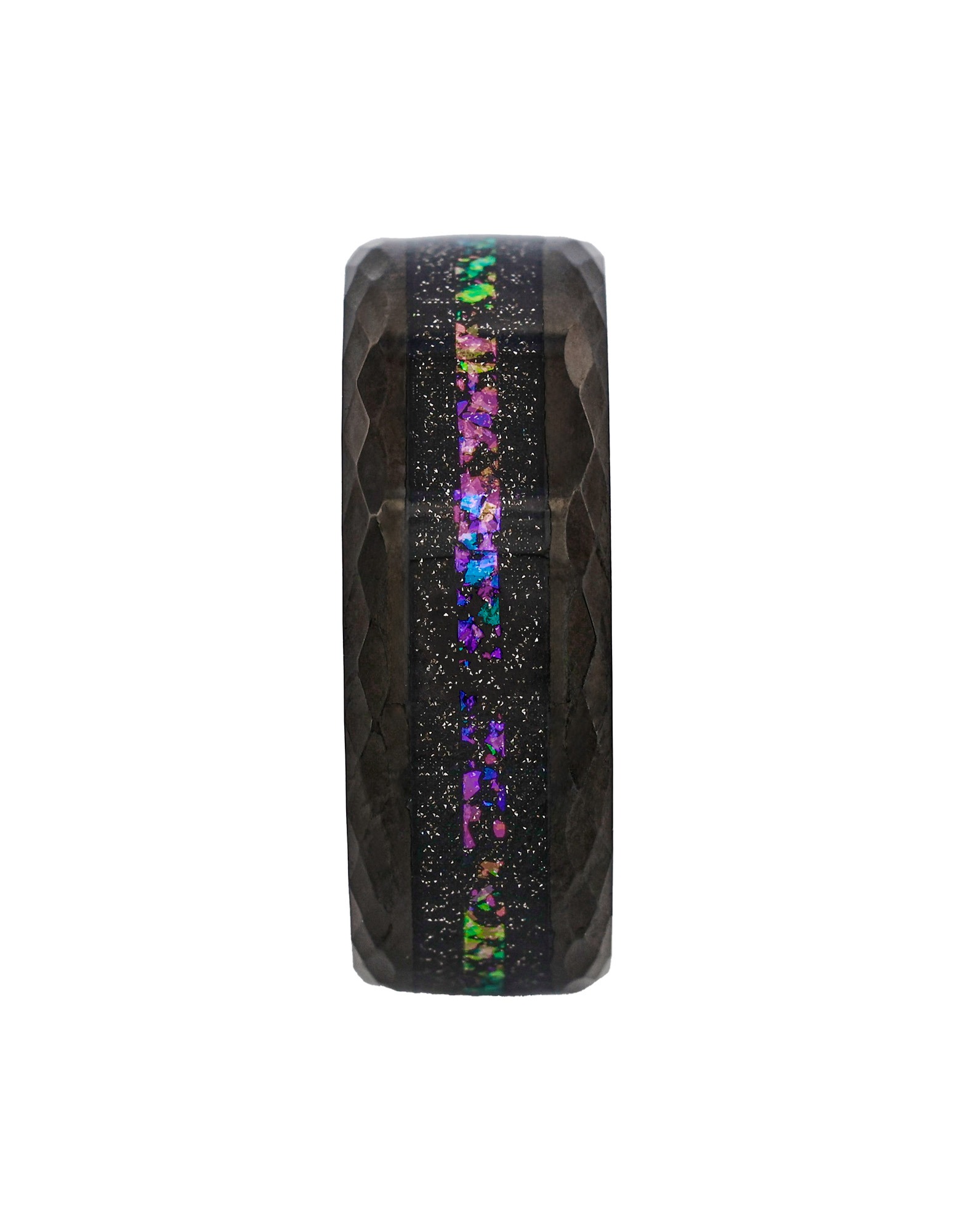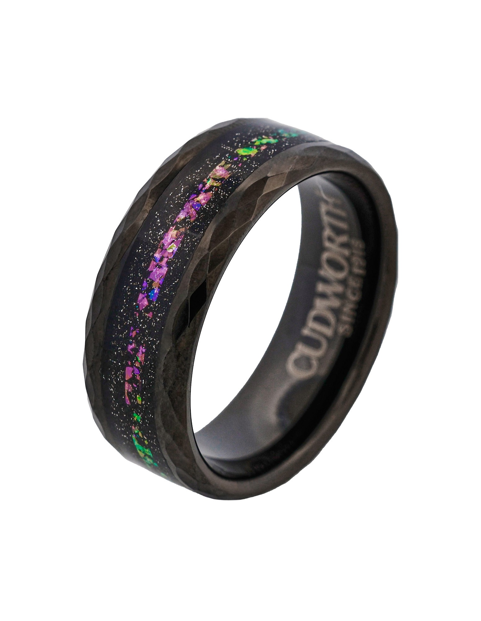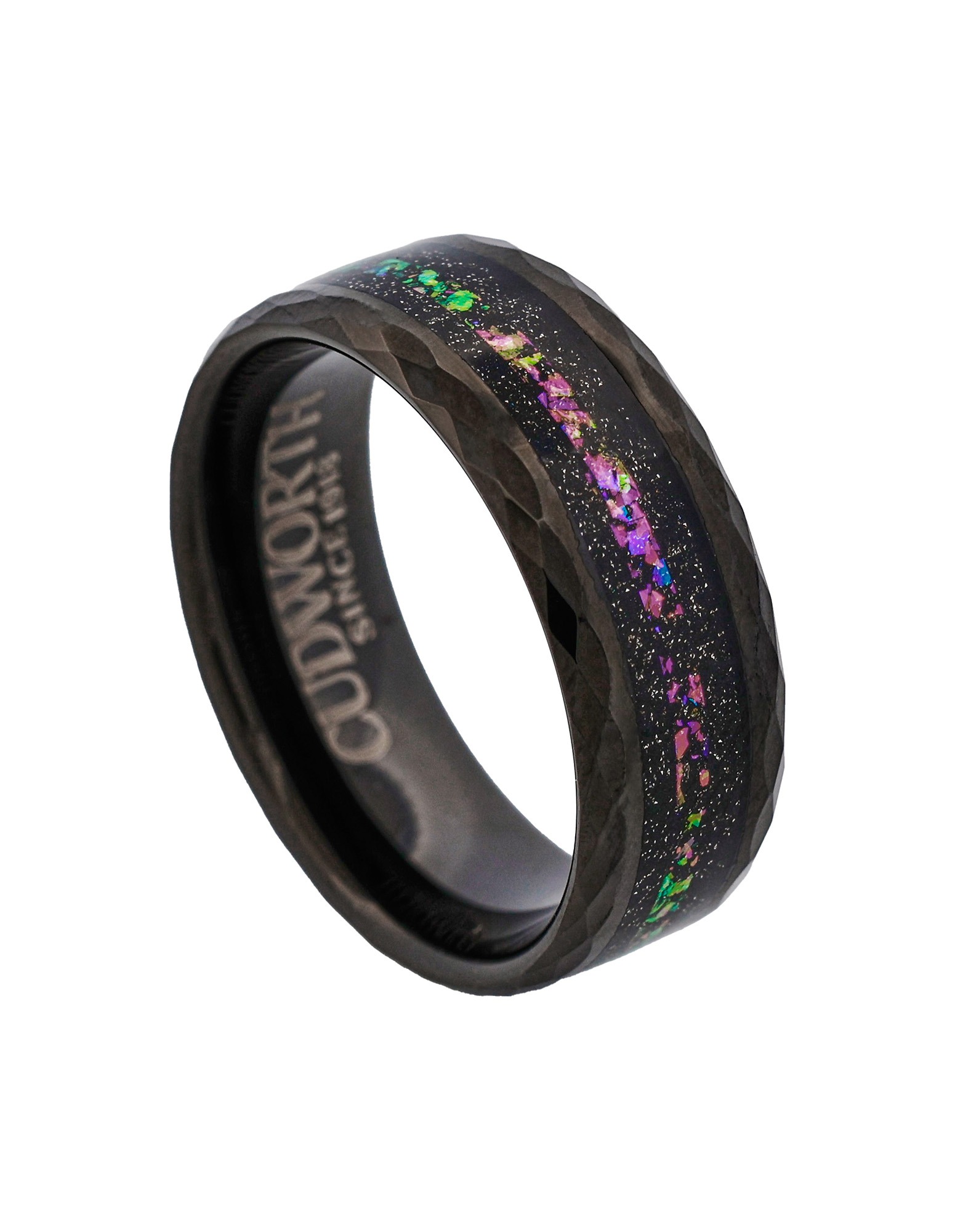Cudworth’s Tungsten Nebula Prism ring combines strength with striking cosmic detail. Crafted in faceted black tungsten, the design features an iridescent opal inlay that shifts with light, giving a galaxy-inspired finish. Durable and contemporary, it’s made for men who want jewellery with impact and individuality.